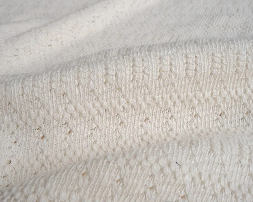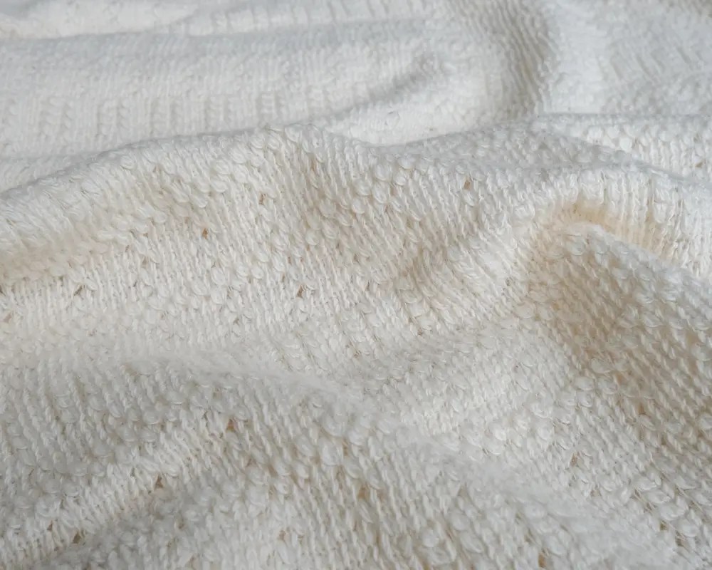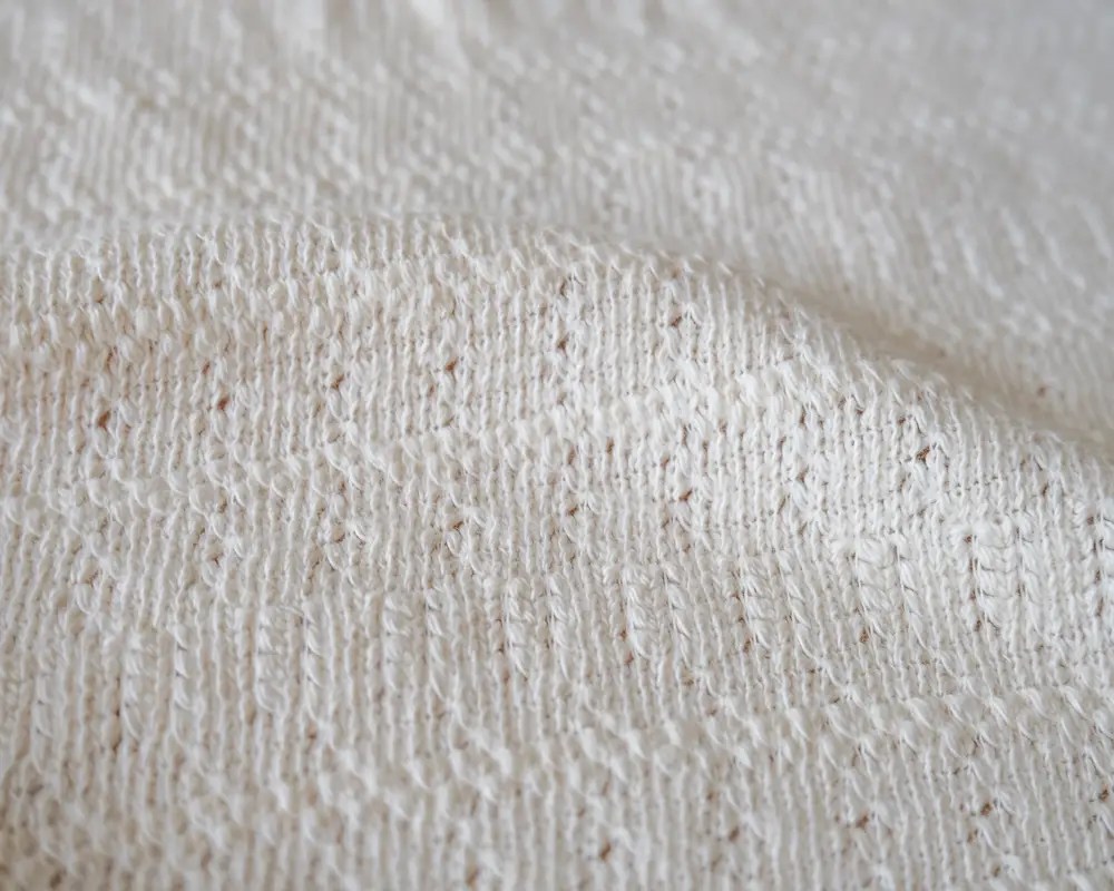 In the natural color of cotton, this knit is made of thick sweater yarn and features beautiful pointelle openwork. The fabric has a lovely drape and a super soft feel. The weave is not a rib knit so it has a mild stretch. We recommend using this to make something loose-fitting like a pullover sweatshirt.